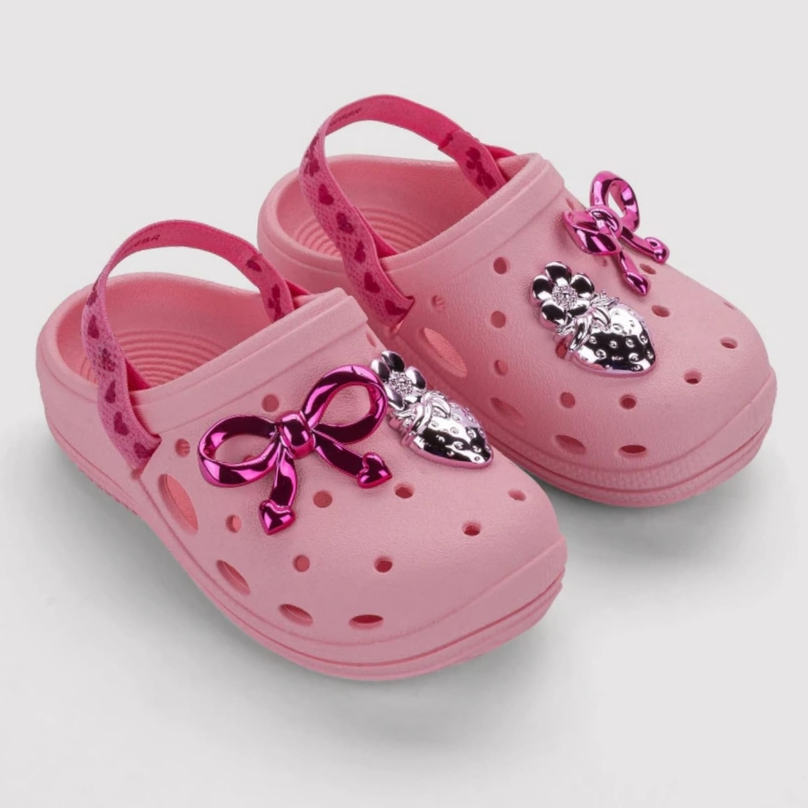 O Babuche de Bebê Daisy Zaxynina chega cheio de charme e delicadeza para acompanhar as pequenas no dia a dia. O modelo traz os furinhos tradicionais, que ajudam na ventilação e no conforto, além de apliques metalizados de laço e morango, que adicionam um toque lúdico e encantador ao visual. O elástico traseiro com grafia de corações garante praticidade no calce e mais segurança, deixando o babuche ainda mais confortável e fofo para diversas ocasiões.
