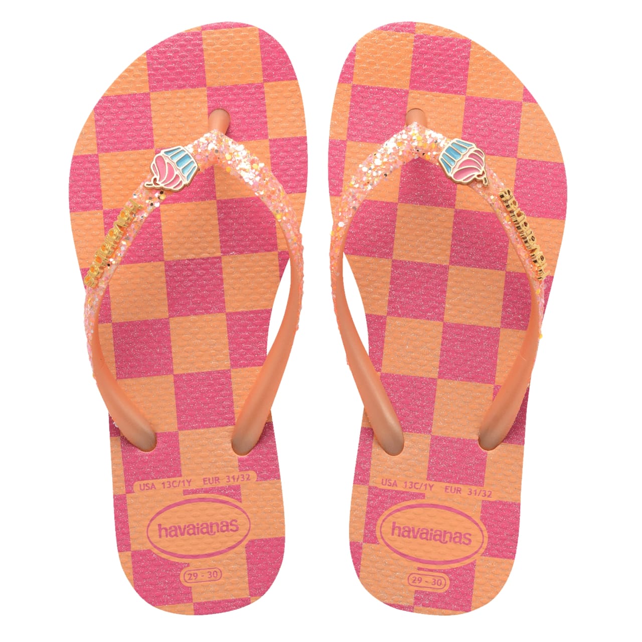 A Chinelo Infantil Menina Havaianas Glitter- Pessêgo é perfeita para as pequenas que amam cor, brilho e diversão nos pés. Com estampa em xadrez rosa e laranja e tiras translúcidas com glitter, ela traz um charme especial para qualquer look. O detalhe do aplique em formato de cupcake deixa o modelo ainda mais fofo e delicado.