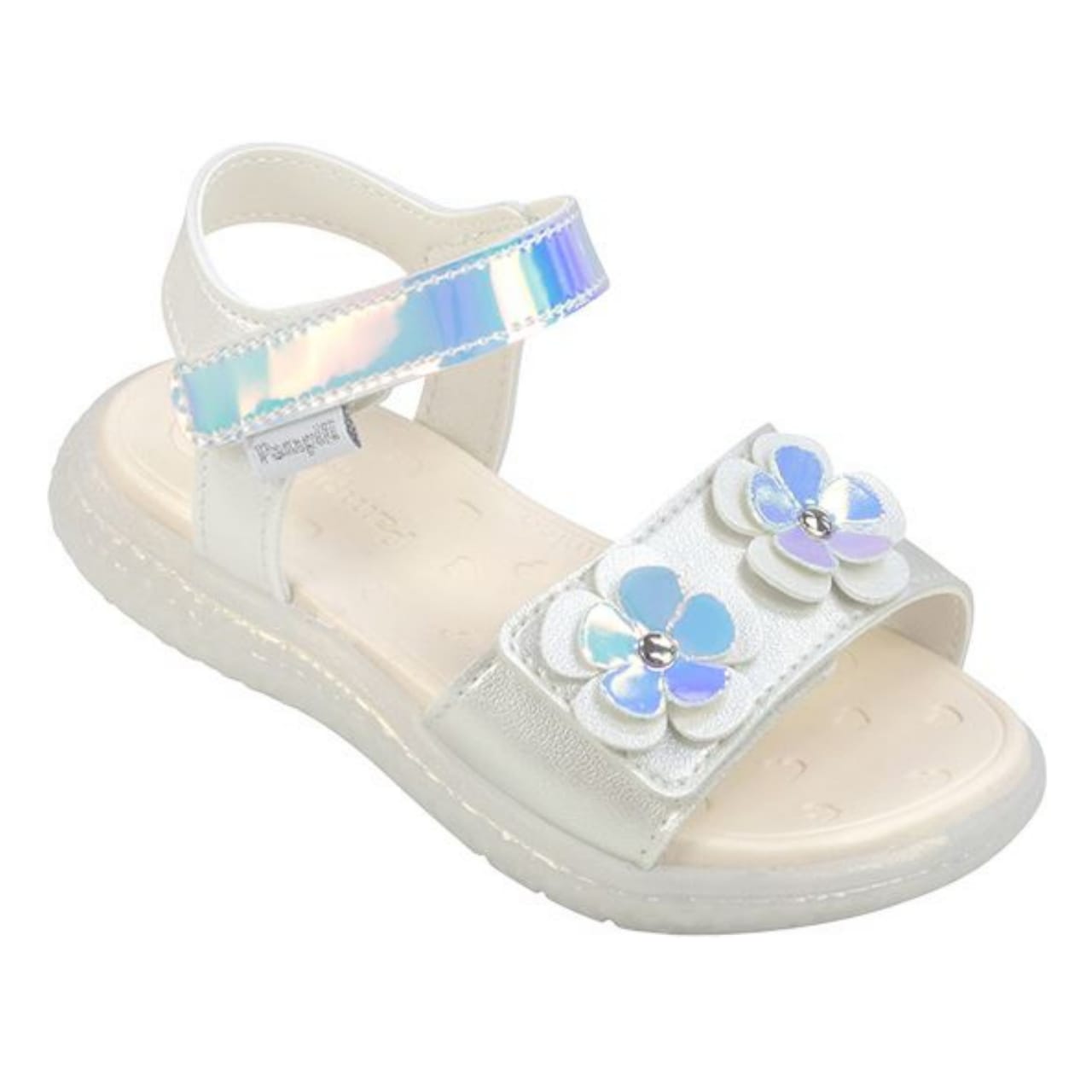 Sandália papete infantil feminina em material perolado branco com flores holográficas em alto relevo, encantadora e confortável para todos os momentos.