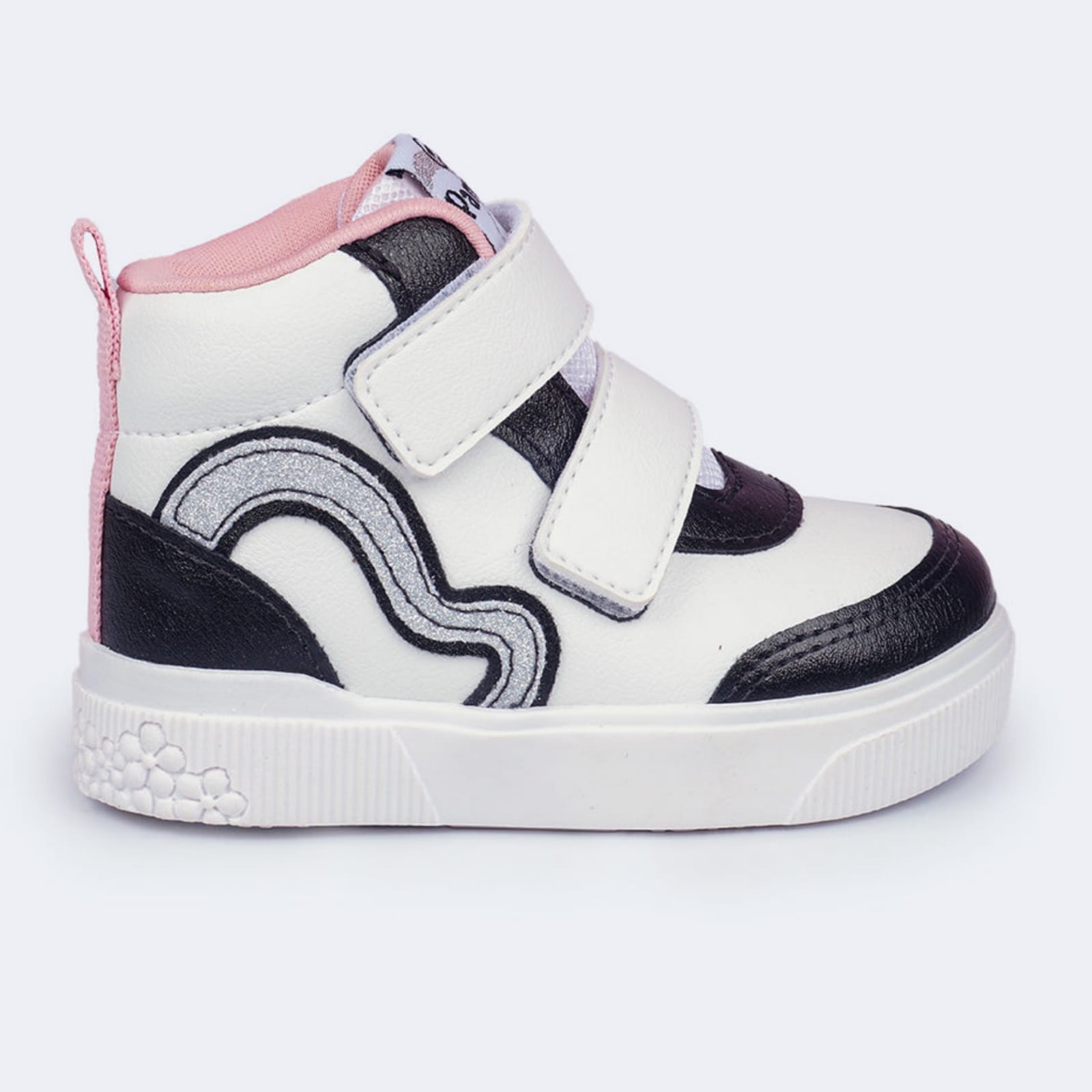 Disponível na clássica combinação Preto e Branco com detalhes em Rosa, este modelo é versátil o suficiente para ir da escola aos passeios de final de semana com muito charme.